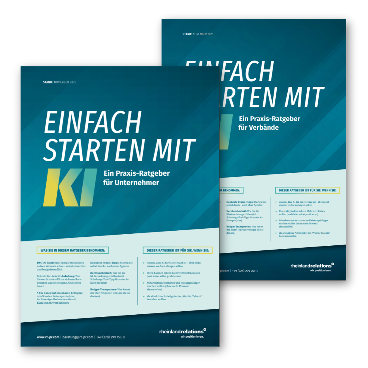 In unserem KI-Whitepaper erhalten Sie praxisnahe Tipps, konkrete Beispiele und einen klaren Fahrplan für den sicheren und sinnvollen Einsatz von KI. Wählen Sie einfach die passende Ausgabe – für Verbände oder für Unternehmen – und starten Sie direkt mit Ihrem KI-Projekt.